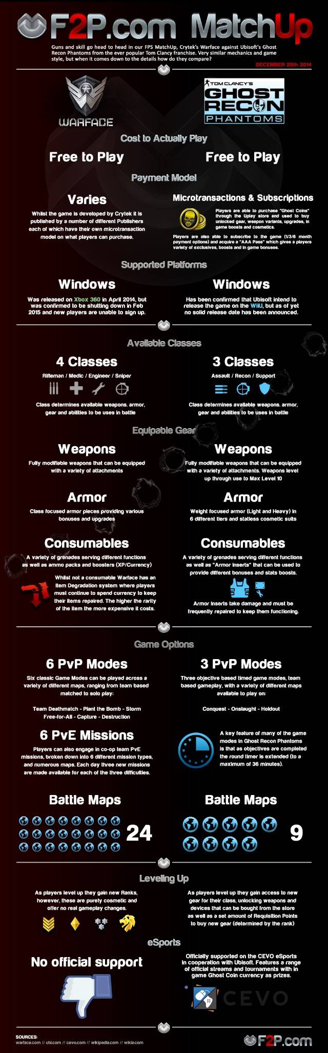 Siempre es difícil escoger que juegos poner a prueba en nuestras comparativas, ya que tienes que buscar juegos que sean lo suficientemente similares como para poder hacer una comparativa, y que no haya sido hecha por otra gente hasta la saciedad. Algunas veces la dificultad radica en que los juegos son tan similares que es difícil diferenciarlos; este es el caso de Warface y Ghost Recon Phantoms. Ambos juegos son conocidos (aunque Ghost Recon lo es bastante más por la saga Tom Clancy: Ghost Recon de Ubisoft, por otro lado Warface no se queda atrás ya que Crytek es también muy conocido) y antes de hacer la comparativa quizá ya teníamos un favorito, y descubrimos que estábamos algo equivocados.