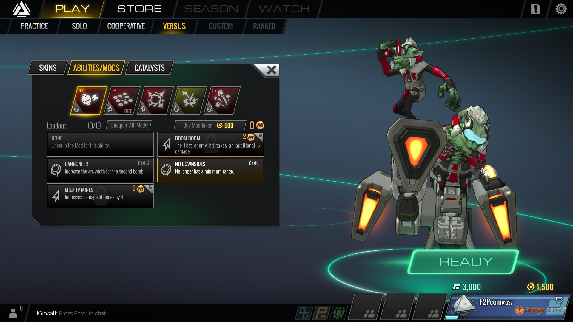 Una vez escogido el personaje, a nuestra disposición tenemos el modo práctica, el modo contra bots (con compañeros humanos o no) y el modo PvP. Sin embargo, las partidas competitivas y el modo personalizado están restringidos; sólo las cuentas de pago pueden acceder. No obstante, jugando a estos modos todavía tenemos la posibilidad de conseguir los regalos de temporadas (distintas misiones), por lo que es posible conseguir experiencia y subir de nivel con una cuenta totalmente gratuita para obtener cajas de recompensas. Pero en este aspecto también hay una restricción, y es que los jugadores de cuenta gratuita sólo pueden abrir una caja cada 36 horas.