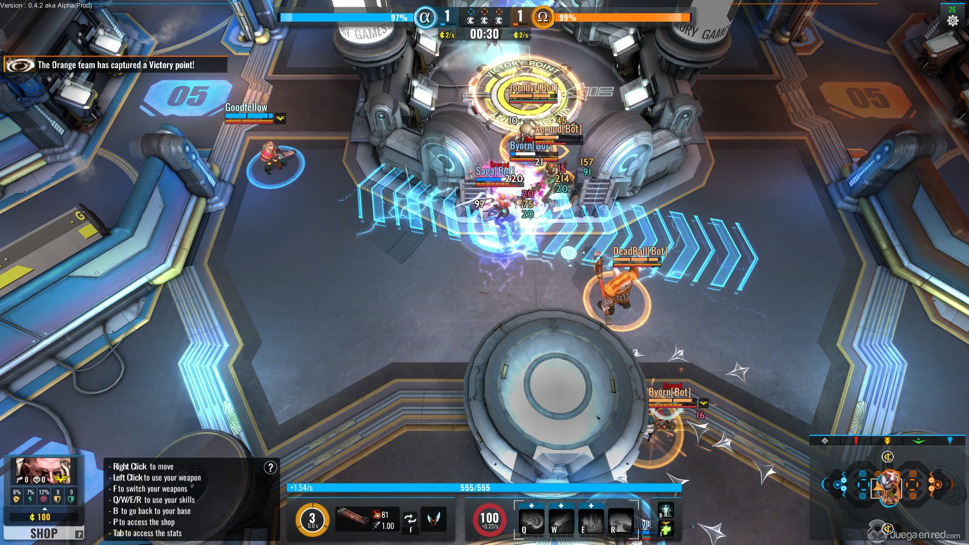 El juego cuenta con dos mapas distintos, aunque se nota que han dedicado más tiempo a desarrollar uno de ellos, Arkashan Arena, que es el más parecido al de los MOBA estándar, aunque se centra más en capturar puntos de control. En este mapa nuestro objetivo es destruir la base enemiga, la cual está protegida por dos letales torretas y un escudo de energía; las bases están conectadas por dos líneas, y en el mapa hay tres puntos de control que los equipos tienen que controlar para desactivar temporalmente el escudo protector de la base enemiga. El problema es que actualmente las torres de los núcleos son MUY poderosas y es muy difícil destruirlas para acceder al núcleo enemigo, por lo que necesitaremos varios intentos antes de poder destruir la base enemiga.