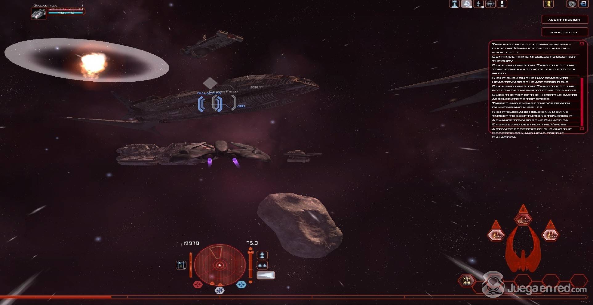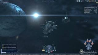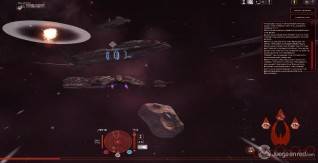 Para comenzar nos recibe una cadena de misiones que sirven a modo de tutorial y ayuda a comprender los conceptos de movimiento, combate y minería en asteroides. Sus controles y sistemas de combate ofrecen una interesante mezcla de acción y selección de objetivos. Básicamente ves la nave en tercera persona y utilizas la rueda del ratón para regular la velocidad, pulsas el botón derecho y mueves el cursor para orientar la dirección y el izquierdo para seleccionar objetivos e interactuar con la IU, los controles WASD para moverse, la barra espaciadora para los potenciadores y diferentes teclas para otros controles básicos. En el centro de la pantalla hay una retícula y cuando apuntas al enemigo, y estás a la distancia adecuada, las armas normales disparan disparan automáticamente. Todo ellos a veces parece un poco lento y no responde a la perfección, pero puede ser debido a que somos unos novatos y no estamos familiarizados, aunque Star Conflict utiliza el mismo sistema y desde el primer momento sentimos que era más intuitivo y respondía mejor.