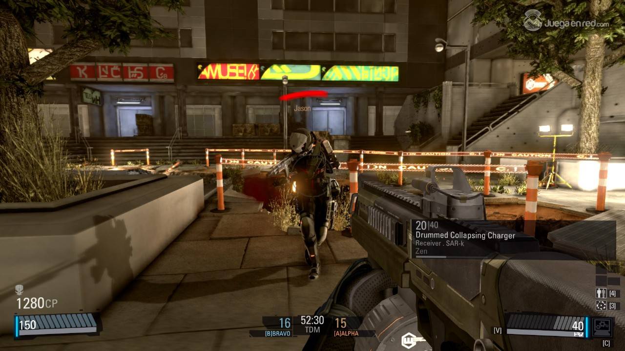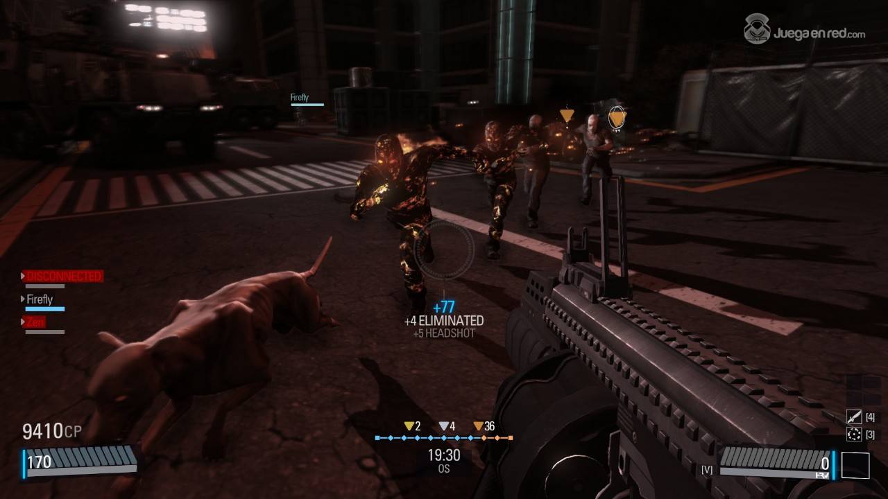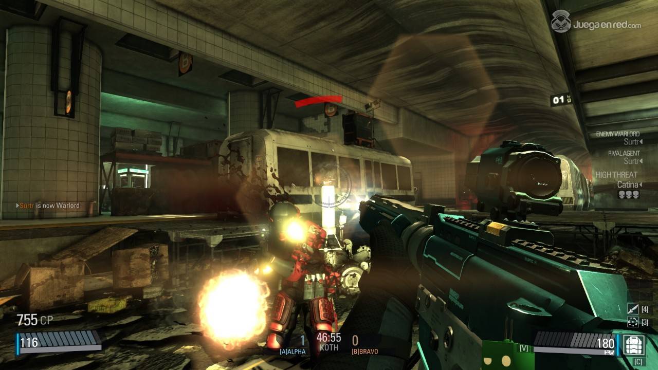 Después de explorar este apartado decidimos probar una partida y entramos en una aleatoria de Team Deathmatch. Los controles son los típicos: teclas WASD + espacio + control para moverte y apuntar y disparar con el ratón. Lo interesante es cuando pulsas la 'V', que permite utilizar el HRV, un especie de escáner que te permite ver los enemigos y aliados a través de los muros y las diferentes superficies durante un breve periodo de tiempo, y que se recarga después para volver a ser utilizado. Esta interesante herramienta está disponible para todos los jugadores desde el principio, lo que proporciona una experiencia justa para todos y libre de francotiradores inmóviles, además de aportar el ingrediente necesario para tener que adoptar diferentes estrategias poco frecuentes en los FPSs.