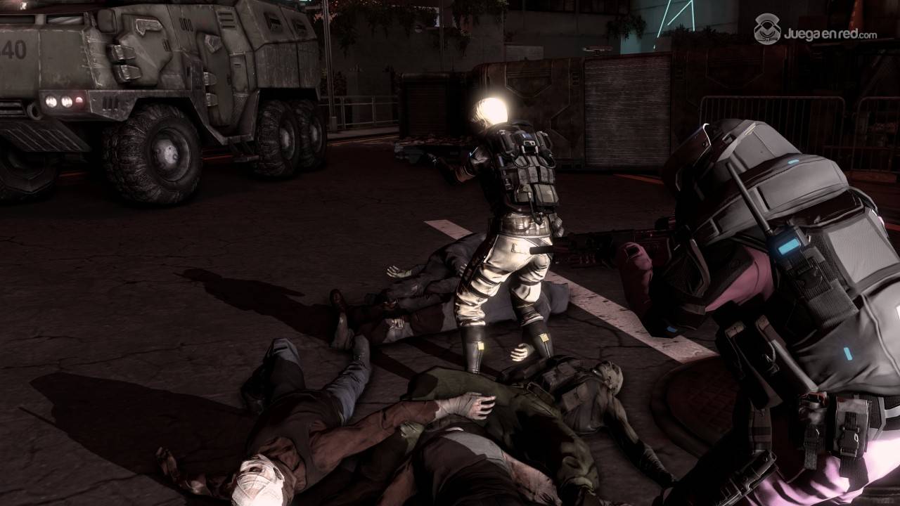 Una vez descargado de una de las dos plataformas debemos crear un personaje, eligiendo únicamente su nombre y género. Puedes jugar el tutorial u omitirlo, ya que si has jugado a algún título de este género tampoco te va a enseñar nada nuevo. La única información útil que te proporciona el tutorial es cómo utilizar el HRV (Hyper Reality Visor), una característica única de Blacklight Retribution, cómo pedir los packs de suministro de vida/munición y cómo manejar el hardsuit, la armadura mecanizada gigante.