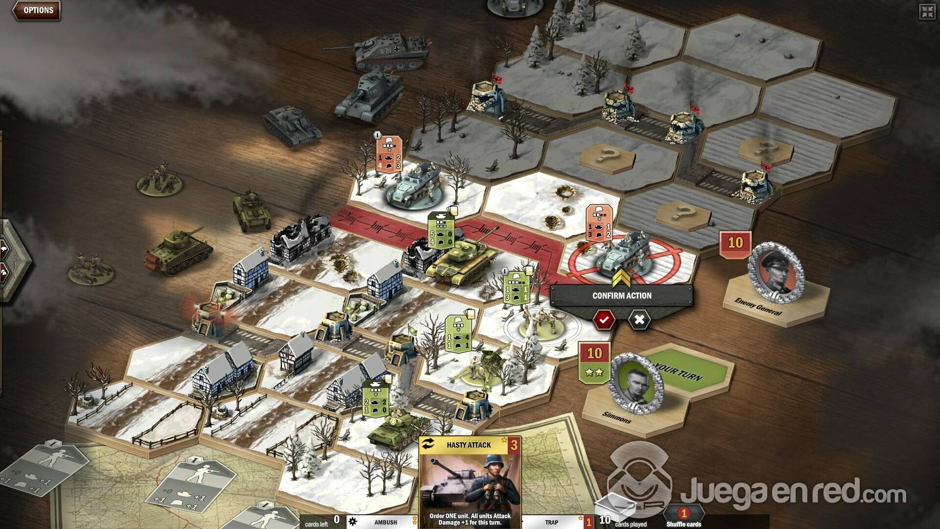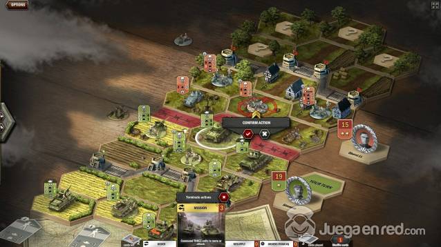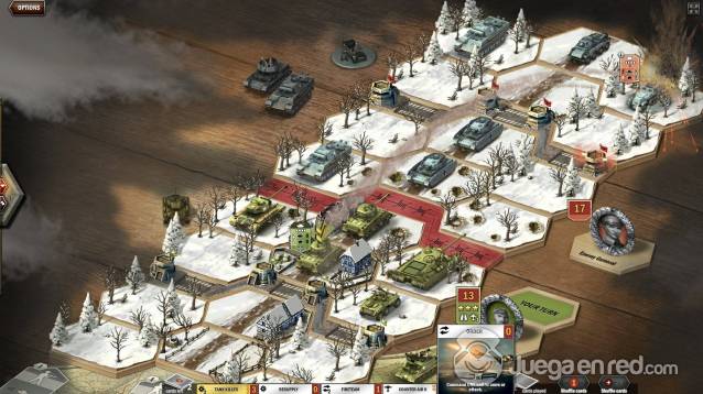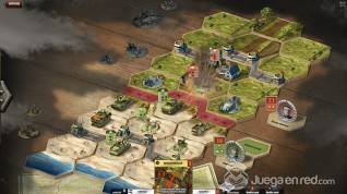 En el tutorial, encarnamos a un grupo de aliados que se enfrentaba a una pequeña ofensiva nazi (aunque cuando terminas el tutorial puedes jugar con la facción que prefieras), así que nos pusimos manos a la obra, desplegamos nuestro ejército y empezamos a usar nuestras cartas de mando para intentar acabar contra el enemigo. Un punto de vital importancia es la línea de visión, pues solo puedes atacar aquellas unidades de las que tengas línea de visión directa (aunque hay unidades que pueden atacar todo el campo de batalla), lo que hace que puedas atacar a unidades en la retaguardia o la base enemiga. Si consigues tener una línea de tiro limpia a la base del contrincante, le harás daño directamente, reduciendo así sus puntos de mando (los mismos que necesitas para hacer que tus unidades ejecuten acciones)