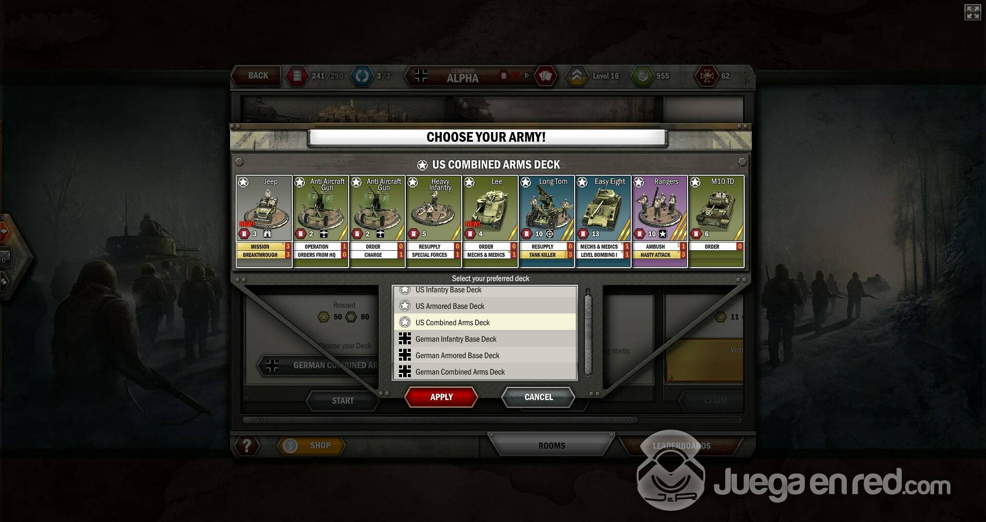 Una vez completado el tutorial, intentamos probar otras características del juego, pero muchas de ellas, incluidas las batallas PvP estaban bloqueadas hasta llegar al nivel 6, un mero trámite que sirve para adaptes a las mecánicas de juego. Por otro lado el juego dispone de una larguísima campaña PvE que cuenta con aproximadamente 150 misiones, tanto del bando aliado como de eje, en las que recrearemos al peculiar estilo del juego batallas que transcurrieron realmente. Al completar misiones conseguirás dinero, con el que podrás comprar potenciadores temporales y sobres de cartas adicionales, y experiencia, con la subirás de nivel, pudiendo así ganar acceso a otras características y a más unidades.