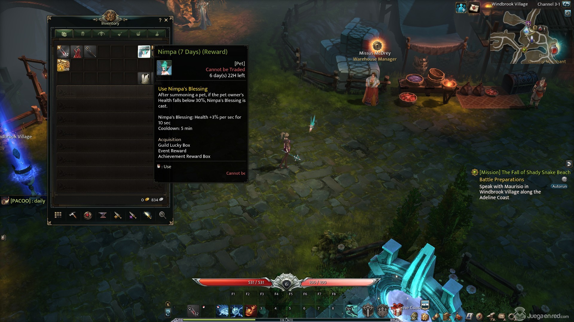 En la cuenta que nos proporcionó Trion Games teníamos varios potenciadores además de tiques de expansión de inventario (que son muy útiles y necesarios), espacios adicionales para personajes (por defecto tenemos dos, una montura oso polar, y una mascota corgi (si, el perro) que nos proporciona algunas mejoras cuando está a nuestro lado. También teníamos 50 cuernos de anuncio, que nos permiten anunciar algo en los chats del juego para que todos los jugadores lo vean… lo cual es útil para los testers, pero un poco molesto cuando grabas videos del juego ya que no puedes esconder la ventana de anuncio o hacer que no te aparezcan (al menos por lo que pudimos ver nosotros).