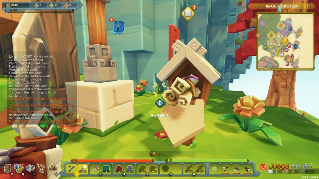 Por último, la hermandad de los gladiadores (Gladiators) es la que se centra en el PvP. Para nosotros, sin ninguna duda, la más divertida. Nos ofrecen la posibilidad de participar en arenas con dos tipos distintos de modos de juego: deathmatch y capturar la bandera. Somos más del estilo del PvP con objetivos en lugar del de matar por matar, así que probamos el modo de capturar la bandera. En este modo equipos de quince jugadores luchan por robar la bandera enemiga y llevarla a su base. Jugando nos topamos con algo que confiamos en que se solucione con el tiempo, pues después de todo el juego aún está en fase alpha. Resulta que los jugadores se van incorporando en la partida de manera progresiva y tienen la opción de escoger el equipo, por lo que hasta que los equipos están completos uno puede encontrarse en batallas totalmente desequilibradas. Y además no parece haber, al menos por ahora, ningún tipo de control en cuanto a nivel de los jugadores. Cuando estábamos a punto de capturar la bandera enemiga nos topamos con un jugador que portaba un hacha enorme y vestía una armadura completa al que no podíamos dañar. Además había construido bloques alrededor de la bandera que nuestra arma era incapaz de destruir. Al final, la primera partida fue un poco frustrante.