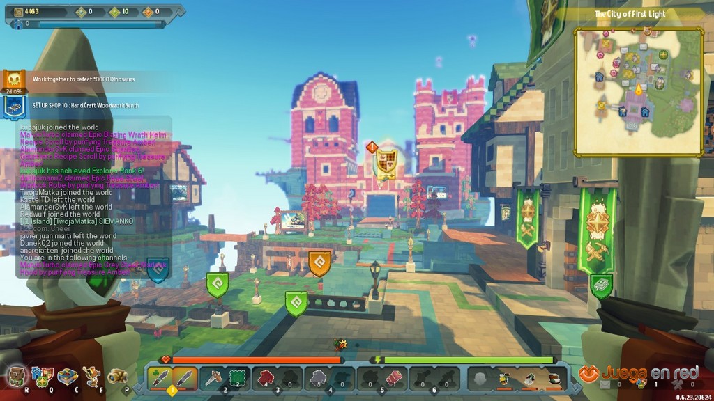 Más tarde fuimos a Primera Luz, “City of First Light”, la ciudad que sirve de punto de encuentro para jugadores y donde hay muchos vendedores y miembros de las tres hermandades principales: Settlers, Gladiators and Explorers. Cada una de estas hermandades ofrece misiones que nos recompensan con monedas para gastar en vendedores especiales y puntos de facción que aumentan el rango con cada una delas hermandades. Los tipos de misiones son distintos en cada caso.