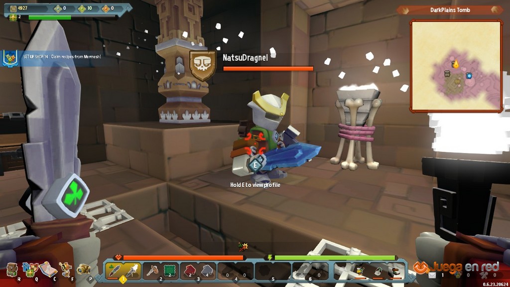 Estas zonas a las que viajamos son inmensas y en ellas uno puede encontrarse cualquier cosa. En nuestra primera aventura a través de un portal nos encontramos con un castillo poblado por caballeros esqueleto. A medida que nos adentrábamos y explorábamos su interior los enemigos se volvían más complicados. Conseguimos llegar hasta las criptas, donde los enemigos se agrupaban y dificultaban el progreso. Allí morimos hasta cuatro veces (puede que no disponer de armaduras y usar armas básicas no ayudase demasiado), teniendo que volver a nuestro cuerpo para recuperar lo que llevábamos encima. Pero así aprendimos que estábamos muriendo porque nos precipitábamos y luchábamos a lo loco, quedándonos sin “stamina” en muy poco tiempo, y esta es necesaria para blandir la espada y atacar. Al final nos topamos con un esqueleto gigante que también nos mató un par de veces más, pero como somos insistentes, continuamos intentándolo hasta que logramos derrotarlo. Resulta que era necesario atacar desde los flancos para conseguir infligir daño. Al matarlo pudimos dar con un cofre del tesoro y después regresamos a nuestra isla.