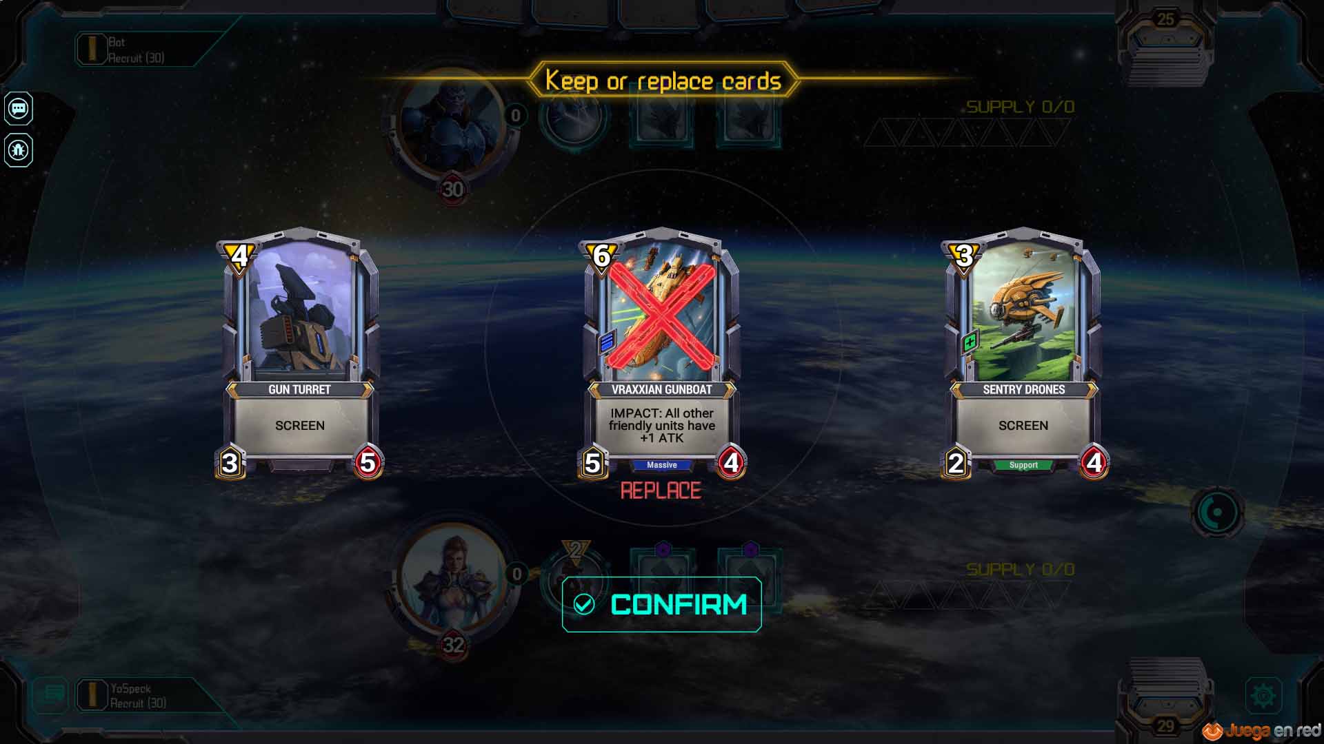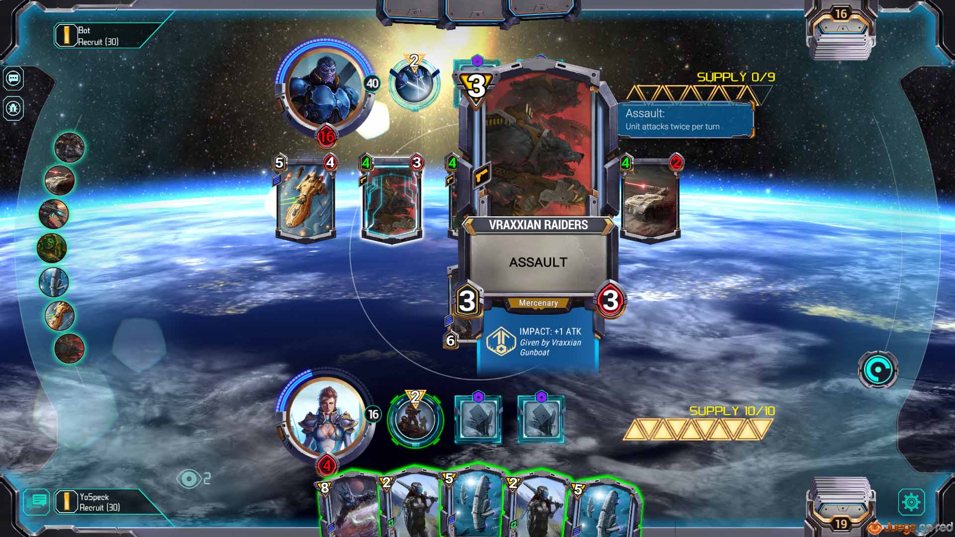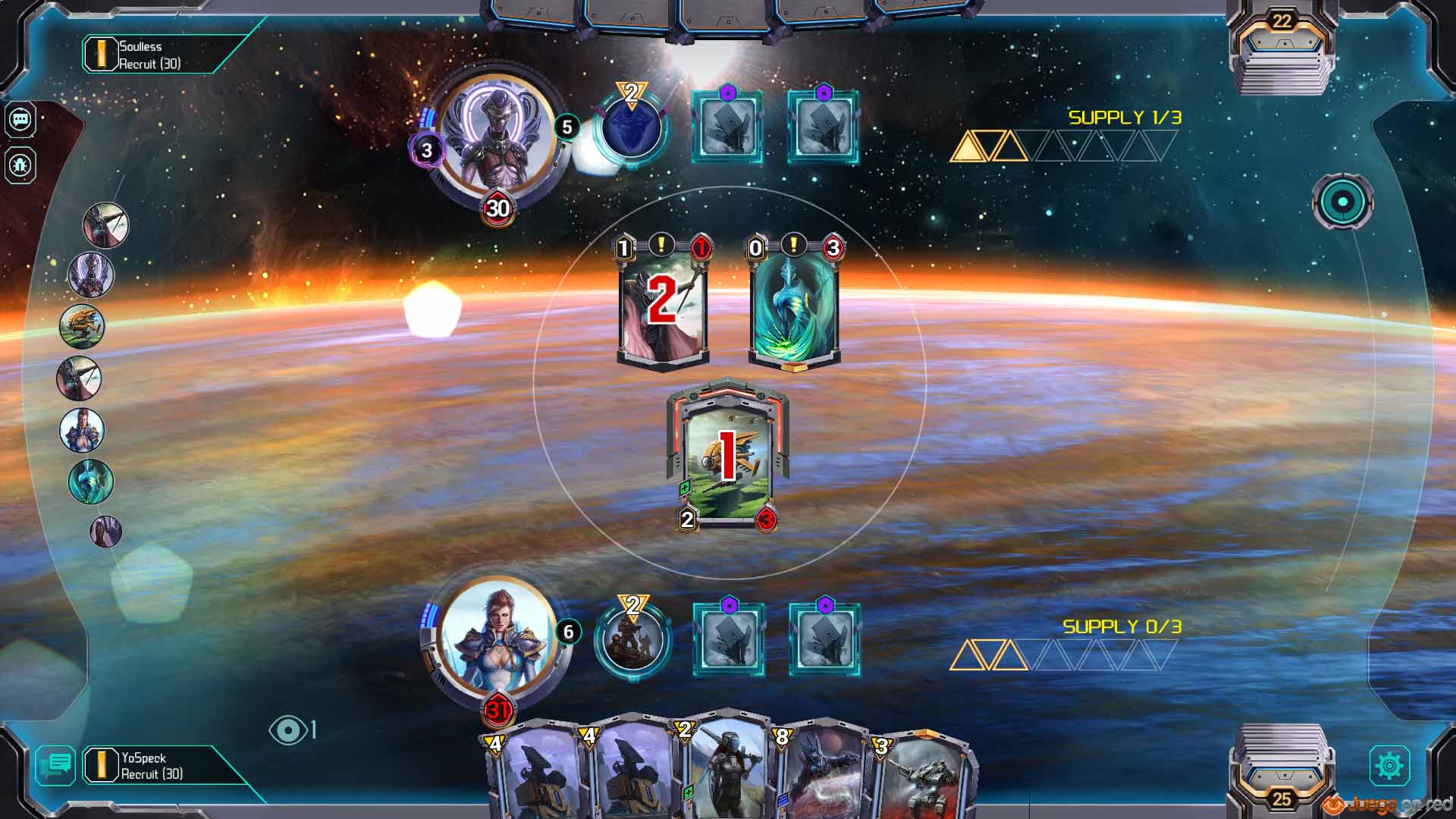 Como en Hearthstone, el jugador consigue un punto de recursos con cada turno hasta un máximo de diez, por lo que es inevitable que durante el transcurso de las partidas el campo de batallas se vaya llenando de unidades cada vez más poderosas. En Star Crusade, además, hay un recurso secundario (energía) que se desarrolla durante cada partida y que se emplea con cartas específicas. Como ejemplo tenemos a la carta-unidad Sniper, capaz de hacer un punto de daño instantáneamente a cualquier objetivo cuando se pone en juego, y que puede volver a colocarse en la mano con un coste de seis puntos de energía; cuando se juega es posible escoger entre utilizarla como una carta normal, que haga un punto de daño y que se quede en el campo de batalla, o utilizarla como una carta táctica con el coste de energía establecido y que permanezca en la mano. Puede que no parezca mucho a priori, pero durante una partida nos topamos con un jugador que tenía una carta capaz de curar a las unidades con Screen (igual que el “taunt” de Hearthstone, un rasgo que obliga a atacar a esas unidades antes que a otras), y utilizando treinta puntos de energía y la carta que comentamos conseguimos neutralizar todas las unidades con “screen” en el comienzo de nuestro turno y abrir camino para tomar el control del juego.