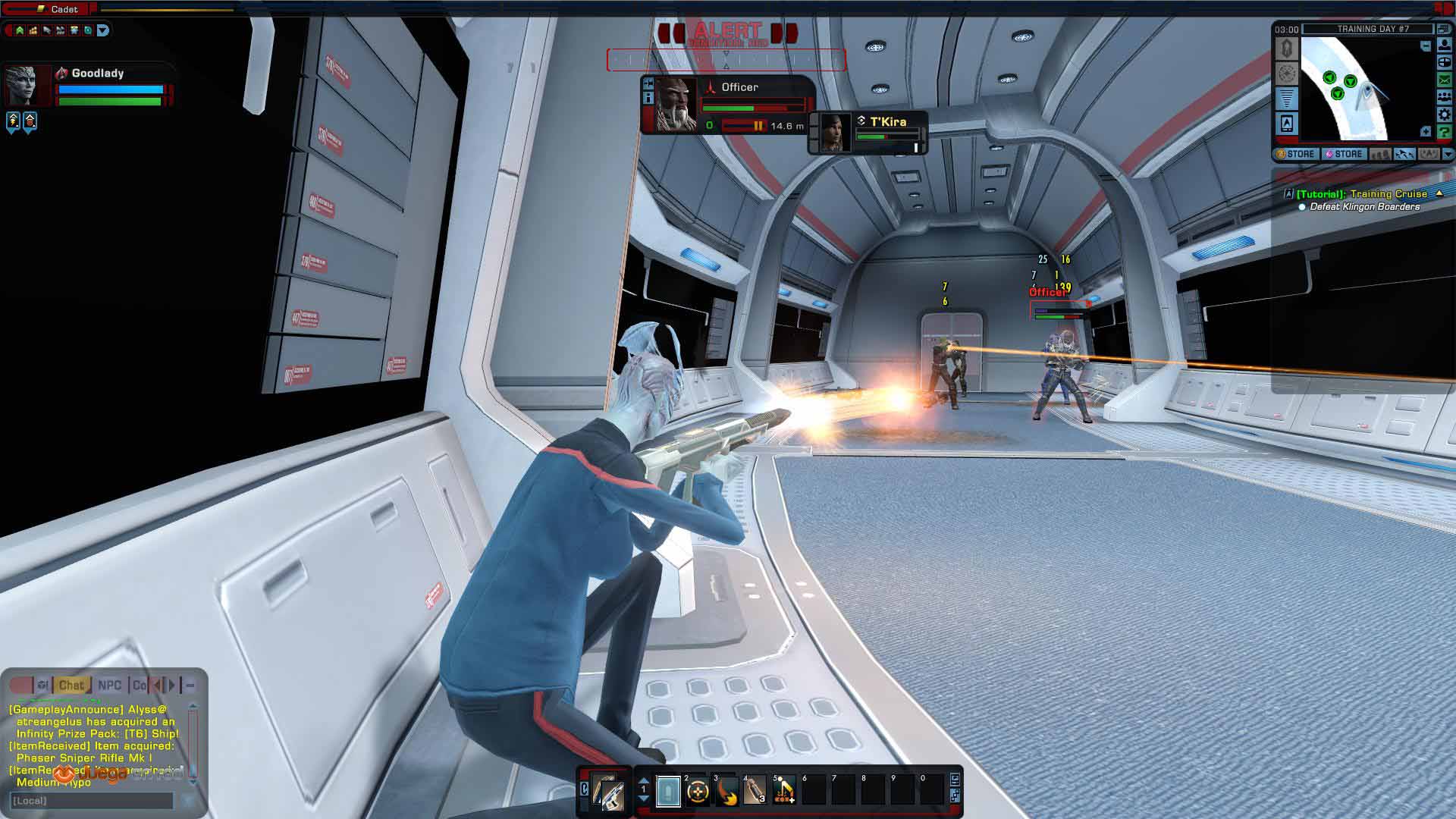 Ya en el tutorial, se nos asignó una nave y el puesto de Primer oficial. Aunque supiésemos de antemano que posteriormente llegas a ser capitán de tu propia nave, la historia es lo suficiente interesante como para que quieras saber cómo llega a ocurrir. Así nos embarcamos en nuestra primera misión, donde pronto nos veríamos acorralados por los Klingon. La acción de Star Trek Online se sitúa en una línea temporal en el que las tres facciones existentes están enfrentadas por el poder. Los atacantes abordaron nuestra nave y tuvimos que hacernos con un rifle para defendernos e ir buscando al resto de integrantes de la tripulación para repeler a los invasores. La historia es muy divertida, te da la impresión de verte como protagonista de una película, sin embargo, el combate es bastante mejorable.