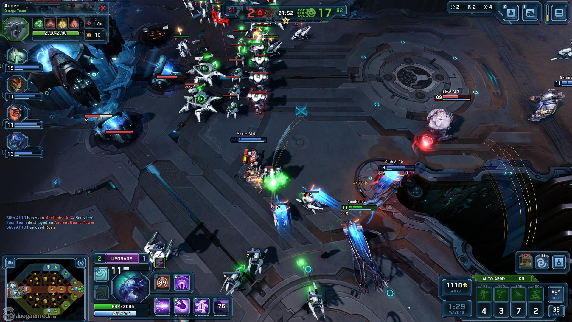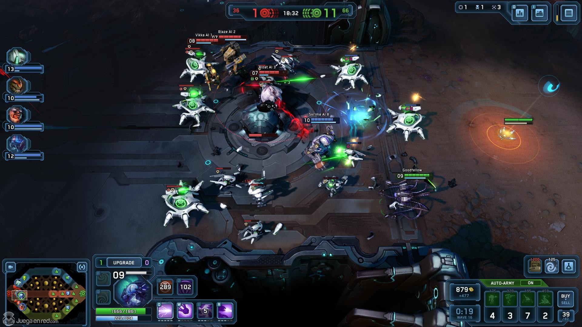 Comenzaremos con lo más importante, ¿en que se parece al resto de MOBAs? En primer lugar el mapa está dividido en tres líneas en las hay varias torres defensivas, y por las que avanzan oleadas de esbirros (en el juego llamados ejércitos), y aunque entraremos en detalles más adelante, las oleadas de esbirros son uno de los aspectos más interesantes del juego. Los jugadores pueden escoger entre 12 personajes (llamados Comandantes) distintos, divididos en dos facciones: Humanos y Ciborgs, cada uno de ellos con sus propios atributos, aspecto y rol (que pueden ser Tanque, Asesino, Francotirador, Luchador, Hechicero y Apoyo). Hasta ahora todo os resulta familiar ¿Verdad? Pues no os equivocáis, el juego cuenta con todas las características clásicas del género, y el objetivo de cada partida no es otro que avanzar por las líneas destruyendo torres con el objetivo final de acabar con la base del equipo rival. Y como es habitual entre las líneas hay una zona de “jungla” (aunque el mapa actual es un planeta alienígena desértico, por lo que la jungla no es muy selvática) donde hay campamentos.
