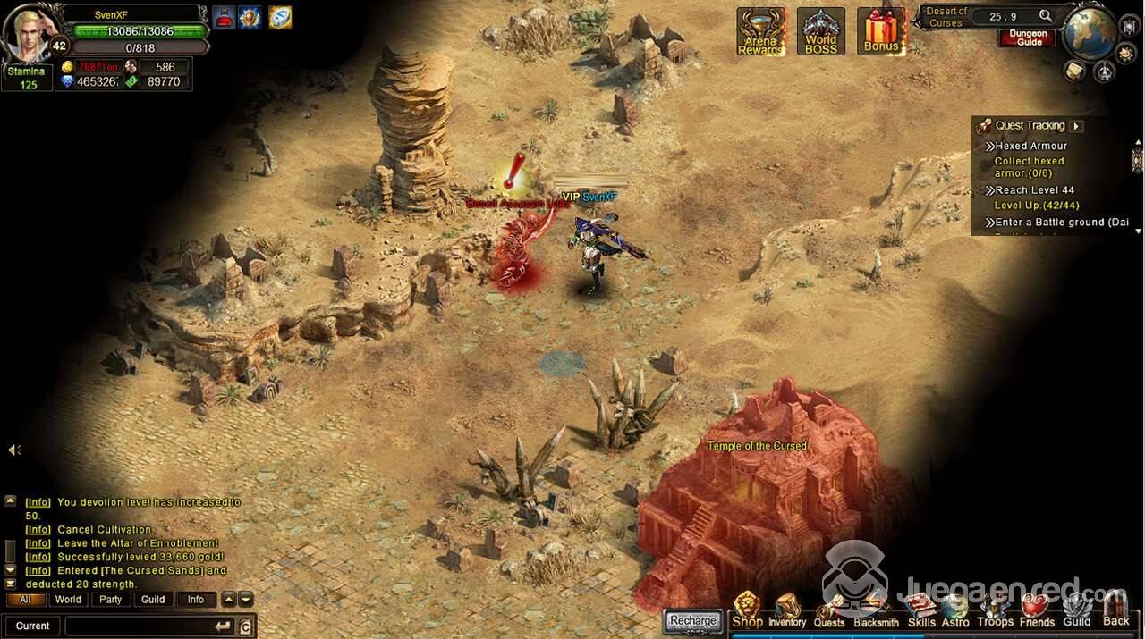 No teníamos muchas esperanza, pero poco a poco fueron apareciendo cosas que nos sorprendieron. Mientras que en otros juegos el combate es completamente automático y los jugadores no tienen ni que presionar un botón cuando se ha iniciado, Wartune cuenta con habilidades que se pueden utilizar si queremos lanzar un rayo de energía a un determinado objetivo o una lluvia de bolas de fuego a un grupo de esbirros. No obstante cuenta con un ataque automático que se realiza si no presionamos ningún botón para activar habilidades, por lo que podemos ganar una pelea sin ni siquiera estar delante del ordenador, aunque esperamos que en los niveles superiores sea más complicado. Algunos de nuestros hechizos solo podían ser activados si contábamos con suficiente furia, lo que muestra que por lo menos hay un elemento que sumerge al jugador en el combate.